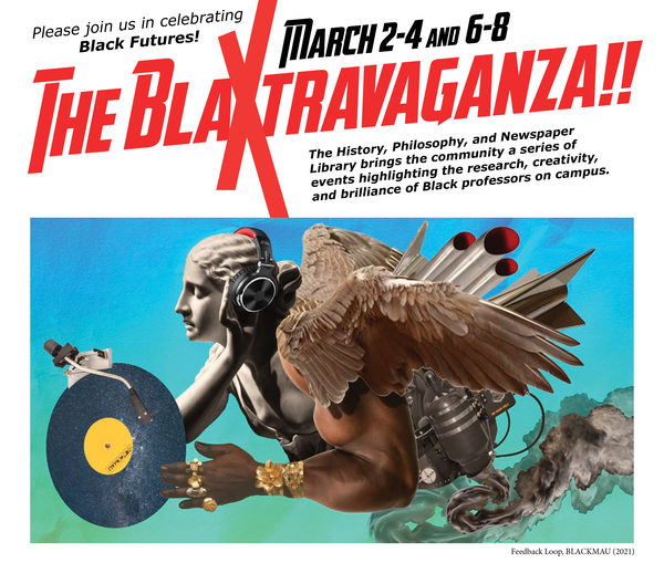 The History, Philosophy, and Newspaper Library (HPNL) invites the community to The Blaxtravaganza Celebrating Black Futures on March 2, 3, 4, 6, 7, and 8. This series of events highlights the research, creativity, and brilliance of Black professors on the University of Illinois Urbana-Champaign campus.