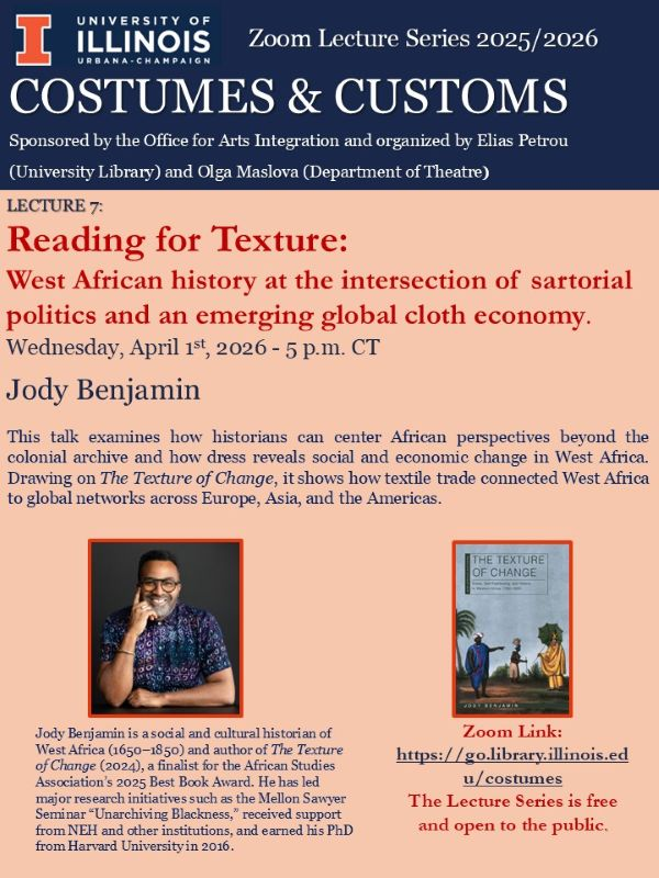 The Costumes & Customs Lecture Series, sponsored by the Office of Arts Integration and organized in collaboration with the University Library, the Department of Theatre, the Department of Classics, the Spurlock Museum, and the Krannert Art Museum, explores the history and cultural significance of clothing across time and place. Organized by Elias Petrou (University Library) and Olga Maslova (Department of Theatre). All lectures will be held via Zoom and are free and open to the public.