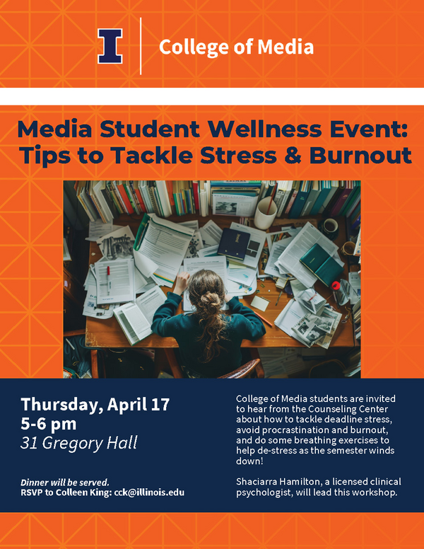 College of Media students are invited to hear from the Counseling Center about how to tackle deadline stress, avoid procrastination and burnout, and do some breathing exercises to help de-stress as the semester winds down! Shaciarra Hamilton, a licensed clinical psychologist, will lead this workshop. Dinner will be served. RSVP to Colleen King at cck@illinois.edu.
