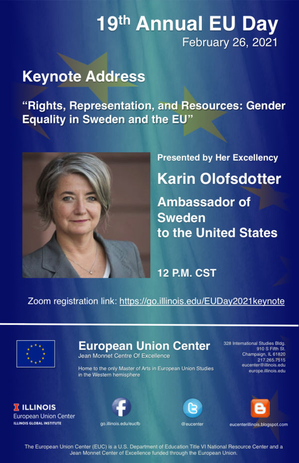 - The European Union Center at the University of Illinois, Urbana-Champaign is honored to have Her Excellency Karin Olofsdotter, Ambassador of Sweden to the United States, provide the keynote address for our 19th Annual European Union Day on Friday, February 26, 2021. Ambassador Olofsdotter's address will outline Sweden’s approach to gender equality; how generous childcare and gender-neutral parental leave have benefitted the GDP of Nordic countries; and why women’s equal access to rights, resources, and representation should be hard foreign policy concerns. In addition to exploring differences between gender equality policies in the European Union and the United States and lessons that we can draw from each other, Ambassador Olofsdotter's presentation will ask: what constitutes a feminist foreign policy?Please register here. For more information on the full EU Day 2021 schedule of events, please see here.About H.E. Karin Olofsdotter:Her Excellency Karin Olofsdotter took up her post as Ambassador of Sweden to the United States on September 1, 2017. Ambassador Olofsdotter has long been a strong advocate for Swedish trade and diplomatic relations with the United States. Trade and economic growth remain top priorities for the Ambassador, along with defense cooperation, public diplomacy, and strong collaboration with the international community.H.E. Olofsdotter brings extensive experience in trade promotion to her current post. Prior to assuming the role as Ambassador, she served as Director-General for Trade at the Ministry for Foreign Affairs. Ambassador Olofsdotter has also held the position of Deputy Director-General and Head of the Department for Promotion of Sweden, Trade and CSR.Ambassador Olofsdotter is also an accomplished diplomat. Her career in the Foreign Service started in 1994 with her first posting to the Embassy of Sweden in Moscow. In the years following, she worked in security policy and defense issues as well as in numerous leadership posts within the Ministry for Foreign Affairs, including serving as Chief of Staff for several of its Ministers.H.E. Olofsdotter has served as part of the Swedish delegation to NATO as well as at the Swedish EU Representation in Brussels, working with European security policy and defense issues. Ambassador Olofsdotter was appointed Director of the Ministers’ Office in Stockholm before being asked to serve as Deputy Chief of Mission at the Embassy of Sweden in Washington, DC in 2008, a post she held for three years. In 2011, she entered her first ambassadorial position as Ambassador of Sweden to Hungary.Ambassador Olofsdotter has a B.A. in psychology, economics and Russian. She studied at UCLA Anderson School of Management and speaks Russian, French and English. She is married and has a son and a daughter.