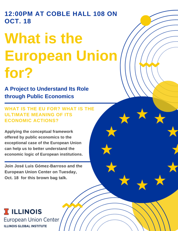 What is the European Union for? What is the ultimate meaning of its actions, particularly its economic actions? Experts in European affairs can talk about the EU structure, institutions, and operations, but it is unclear if the ultimate goals of such structures and operations are properly understood. Applying the conceptual framework offered by public economics to the exceptional case of the European Union can help us to better understand the economic logic of European institutions. Please join José Luis Gómez-Barroso and the European Union Center on Tuesday, Oct. 18 in Coble Hall 108 for this brown bag talk.