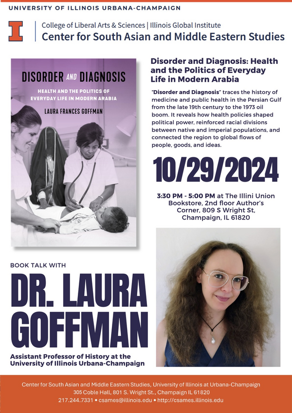Professor Laura Goffman will give a talk about her new book Disorder and Diagnosis: Health and the Politics of Everyday Life in Modern Arabia.