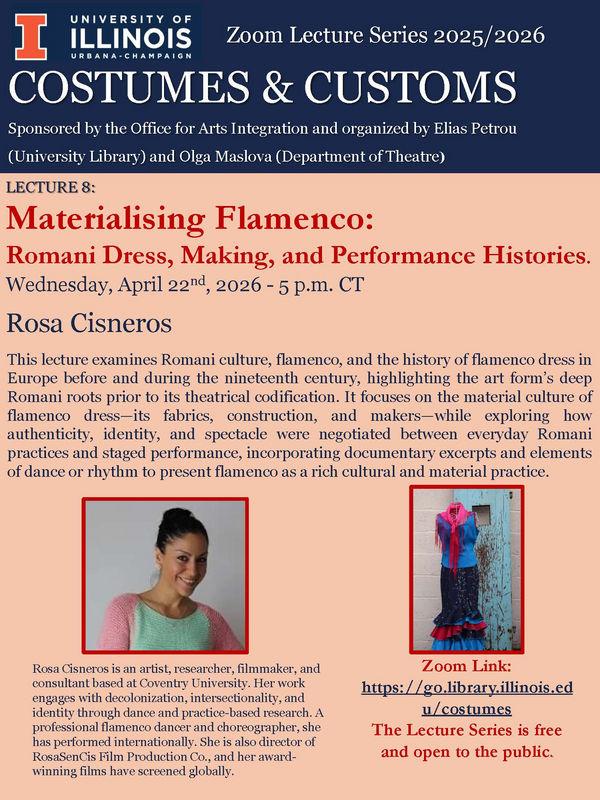 The Costumes & Customs Lecture Series, sponsored by the Office of Arts Integration and organized in collaboration with the University Library, the Department of Theatre, the Department of Classics, the Spurlock Museum, and the Krannert Art Museum, explores the history and cultural significance of clothing across time and place. Organized by Elias Petrou (University Library) and Olga Maslova (Department of Theatre). All lectures will be held via Zoom and are free and open to the public.
