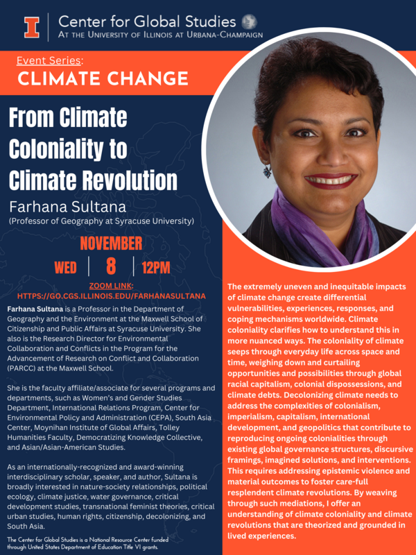 Join the CGS team in welcoming Farhana Sultana (Professor of Geography at Syracuse University) for her virtual lecture, "From Climate Coloniality to Climate Revolution" on Wednesday, November 8th at 12PM.