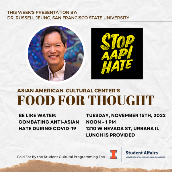 Food for Thought, part of Student Affairs's Lunch on Us series, is a weekly noontime discussion focused on topics relevant to the Asian American community. Past discussions include topics such as nutrition, mental health, sexual health, and media representation of Asian Americans. We also have presentations by campus partners to share information about resources for Asian American and international students. This is our last Food for Thought of the Fall Semester. Our guest presenter is Dr. Russell Jeung, co-founder of Stop AAPI Hate.