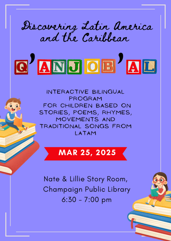 Come with your children to learn in Q'anjob'al the song Jun q'in no' no' xol te', and the name of different animals! Program presented by Adan Francisco Pascual, Q'anjob'al Instructor, and students from the University of Illinois.