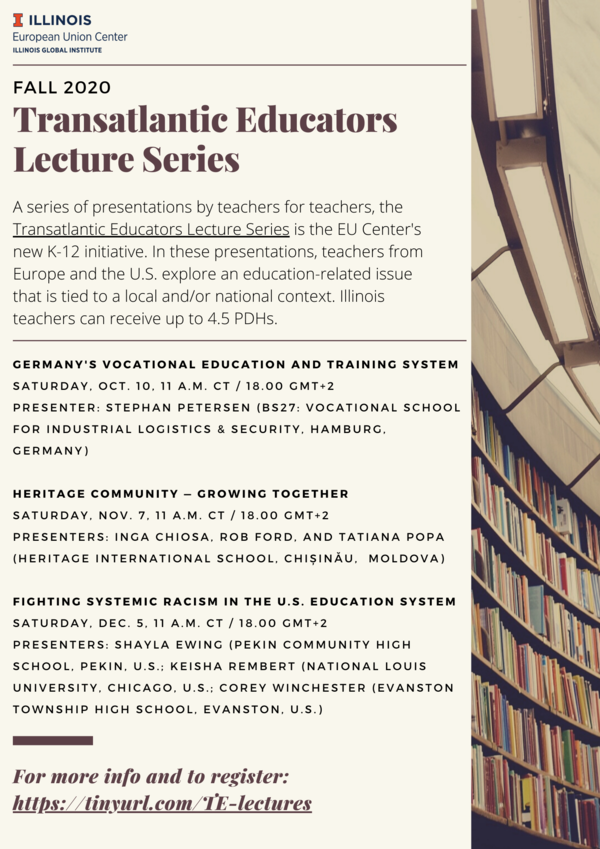 U.S. educators and Teach Plus Illinois Policy Fellowship alumni Shayla Ewing (9-12 English and Drama Teacher, Pekin Community High School), Keisha Rembert (Assistant Professor of Teacher Preparation, National Louis University), and Corey Winchester (11th and 12th grade U.S. History and Sociology Teacher, Evanston Township High School) will speak about their experiences with systemic racism in the U.S. education system. Audience participation is encouraged. This event is part of the European Union Center's new Transatlantic Educators Lecture Series, a series of presentations by teachers for teachers. Presentations in the Transatlantic Educators Lecture Series explore education-related issues that are tied to a local and/or national context.