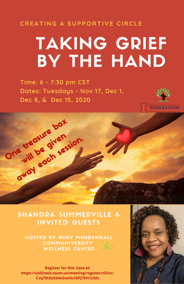 Taking Grief by the Hand: This four-week class is sponsored by the STEM Illinois Communiversity Wellness Center and seeks to create a supportive circle around grief and loss. The class will also provide information about available grief and loss resources. Shandra Summerville will facilitate the class along with invited guests who are experts on the topic and experienced loss. One treasure box will be given away during each class!