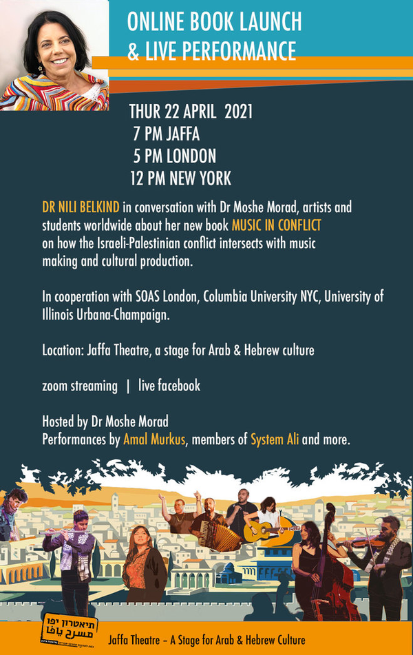 Dr. Nili Belkind will be in conversation with Dr. Moshe Morad, artists and students worldwide about her new book Music in Conflict on how the Israeli-Palestinian conlfict intersects with music making and cultural production. Hosted by Dr. Moshe Morad with performances by Amal Murkus, members of System Ali, and more.