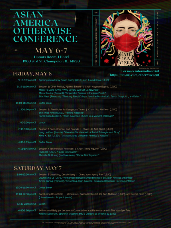 Organized by the Unit for Criticism and Interpretive Theory and the Department of Asian American Studies, "Asian America Otherwise" is the culminating conference of the "In Plain Sight" Research Initiative funded by the University of Illinois Chancellor's Call to Action to Address Systemic Racism and Social Injustice Research Program.