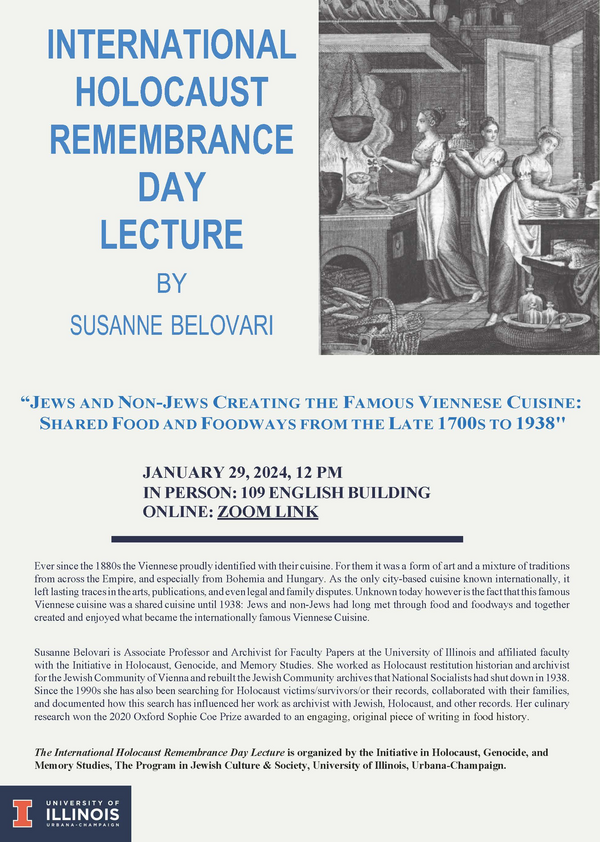 Brett Kaplan (HGMS) will be hosting the International Holocaust Remembrance Day Lecture on January 29, at 12pm. Susanne Belovari (UIUC) will present "Jews and Non-Jews Creating the Famous Viennese Cuisine: Shared Food and Foodways from the late 1700s to 1938".