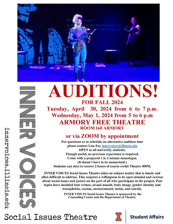 INNER VOICES Social Issues Theatre auditions for Fall 2024 are on Tuesday, April 30, 2024 from 6 to 7 p.m. and Wednesday, May 1, 2024 from 5 to 6 p.m in the ARMORY FREE THEATRE, ROOM 160, Armory Building. QUESTIONS? Please contact innervoices@illinos.edu.