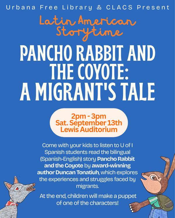 Come with your kids to listen to U of I Spanish students read the bilingual (Spanish-English) story Pancho Rabbit and the Coyote by award-winning author Duncan Tonatiuh, which explores the experiences and struggles faced by migrants. At the end, children will make a puppet of one of the character!