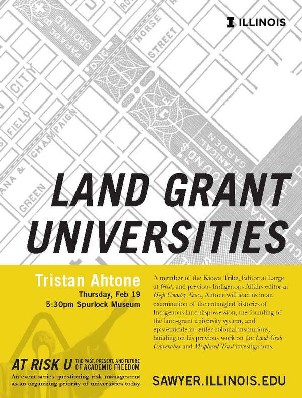 Knight Auditorium, Spurlock MuseumThis presentation examines the entangled histories of Indigenous land dispossession, the founding of the land-grant university system, and epistemicide in settler colonial institutions. Building on the Land-Grab Universities and Misplaced Trust investigations, and drawing from current efforts by the Trump administration to eliminate diversity initiatives at U.S. institutions, this talk draws a direct line between the violent expropriation of Indigenous territories to the erasure of Indigenous peoples on campuses and in American institutions at large, ultimately arguing that ideas of academic freedom cannot be disentangled from questions of historic justice and decolonial action.