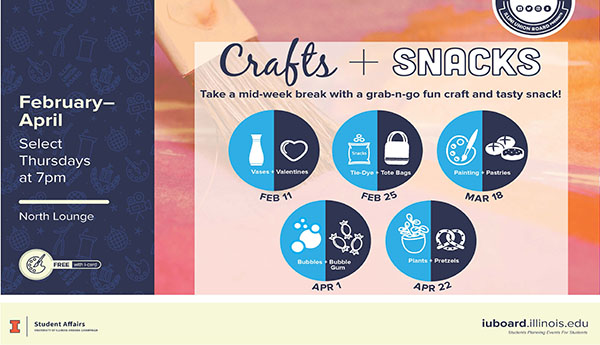 Take a mid-week break with a grab-n-go fun craft and tasty snack! Stop by the North Lounge of the Illini Union for this FREE event, starting at 7 p.m. Tonight's program is Painting and Pastries.