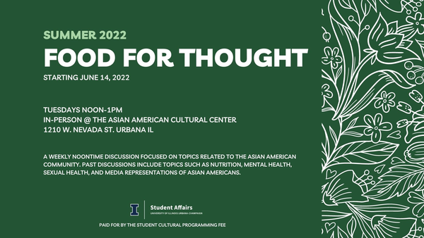 - Food for Thought, part of the Office of Inclusion and Intercultural Relation's Lunch on Us series, is a weekly noontime discussion focused on topics relevant to the Asian American community. Past discussions include topics such as nutrition, mental health, sexual health, and media representation of Asian Americans. For a full list of speakers, please visit: https://oiir.illinois.edu/aacc/our-programs/food-thought