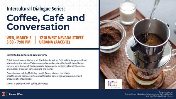 Interested in coffee and café culture? This interactive event is for you! The AACC pro-staff and intern share the unique Vietnamese coffee and explore the health benefits and cultural significance of East Asian cafe drinks, while an IE intern leads a trivia of coffee around the world. Peer educators at the McKinley Health Center discuss the effects of caffeine and compare different caffeinated beverages with recommended amounts of consumption. Dinner is provided, with coffee, of course!