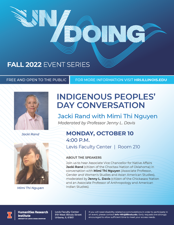 Join us to hear Associate Vice Chancellor for Native Affairs Jacki Rand (citizen of the Choctaw Nation of Oklahoma) in conversation with Mimi Thi Nguyen (Associate Professor, Gender and Women’s Studies and Asian American Studies), moderated by Jenny L. Davis (citizen of the Chickasaw Nation and an Associate Professor of Anthropology and American Indian Studies).