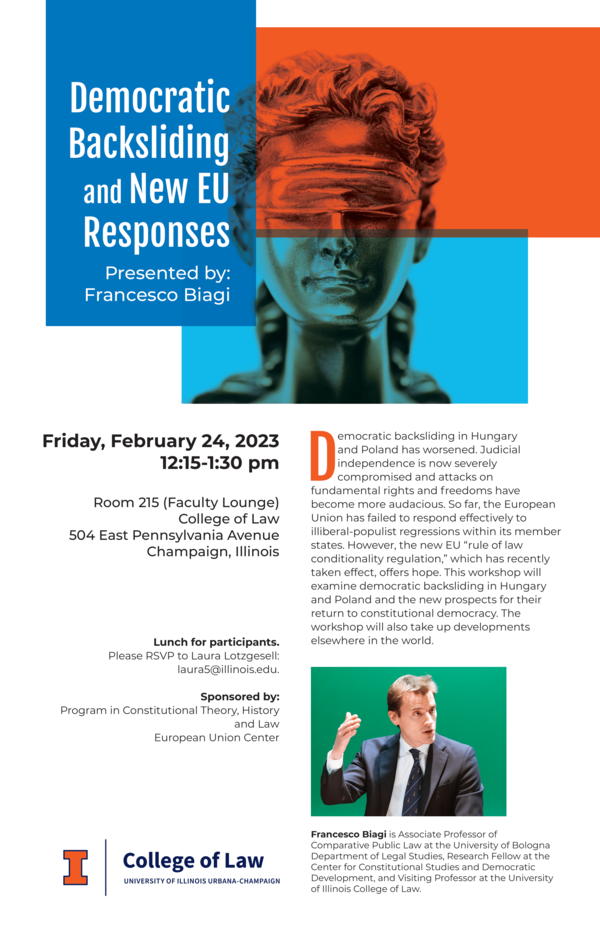 About the speaker: Francesco Biagi is Associate Professor of Comparative Public Law at the University of Bologna Department of Legal Studies, Research Fellow at the Center for Constitutional Studies and Democratic Development, and Visiting Professor at the University of Illinois College of Law.