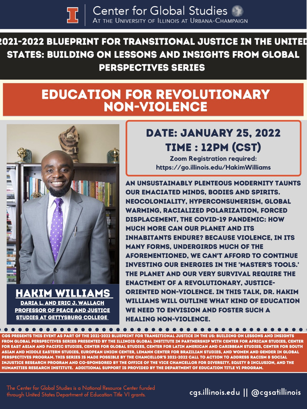 - This event is part of The 2021-2022 Blueprint for Transitional Justice in the US: Building on Lessons and Insights from Global Perspectives Series presented by the Illinois Global Institute and the Midwest Transitional Justice Network in partnership with Center for African Studies, Center for East Asian and Pacific Studies, Center for Global Studies, Center for Latin American and Caribbean Studies, Center for South Asian and Middle Eastern Studies, European Union Center, Lemann Center for Brazilian Studies, and Women and Gender in Global Perspectives Program. This series is made possible by the Chancellor’s 2021-2022 Call to Action to Address Racism & Social Injustice Research Program and co-sponsored by the Humanities Research Institute. Additional support is provided by the Department of Education Title VI Program.