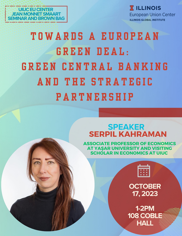 Green central banking and the European Green Deal are two distinct but interconnected concepts that aim to address environmental and climate changes in the context of monetary policy in the European Union (EU). Central banks can support the implementation of the European Green Deal by aligning their policies and actions with the broader objectives of the EU's sustainability agenda. This Jean Monnet SMAART Seminar and brown bag will be given by Dr. Serpil Kahraman, Associate Professor of Economics at Yaşar University and Visiting Scholar in the Department of Economics at University of Illinois, Urbana-Champaign.