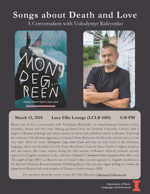 Please join us for a conversation with Volodymyr Rafeyenko, an award-winning Ukrainian writer, translator, literary and film critic. Having graduated from the Donetsk University, Ukraine, with adegree in Russian philology and culture studies, he wrote and published entirely in Russian. Following the outbreak of the Russian aggression in Ukraine’s East, Rafeyenko left Donetsk and moved to a town near Kyiv where he wrote Mondegreen: Songs about Death and Love, his first novel in the Ukrainian language, which was shortlisted for the Taras Shevchenko National Prize, Ukraine’s highest award in arts and culture. His essays written during the first months of Russia’s full-scale invasion recently appeared in English translation in the collection Ukraine22: Ukrainian Writers Respond to War. His novel The Length of Days (2017) on Russia’s war in Ukraine’s East recently appeared in English translation at the Harvard Ukrainian Research Institute Publishing House. His new play Signals of Being, or Verbum carofactum about Russia’s full-scale invasion of Ukraine is forthcoming in 2025.