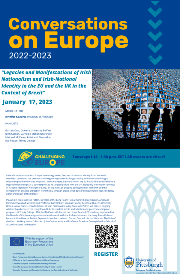 The European Studies Center at the University of Pittsburgh’s Conversations on Europe series of moderated virtual roundtables connects experts from North America and Europe to discuss contemporary issues facing Europe and the Transatlantic relationship. For the 2022-23 academic year, the European Studies Center has announced its annual programmatic theme: “Challenging Europe.” All the conversations for the coming year discuss challenges facing Europe and all are being organized by faculty affiliates of the European Studies Center at the University of Pittsburgh. Topics cover such varied subjects as the effects of Brexit, environmental issues, democracy in Europe, migration, and recovery of Nazi-looted art.This event series is co-sponsored by:Miami-Florida Jean Monnet European Center of Excellence at Florida International UniversityEuropean Union Center at the University of Illinois, Urbana-ChampaignCenter for European Studies at the University of Florida