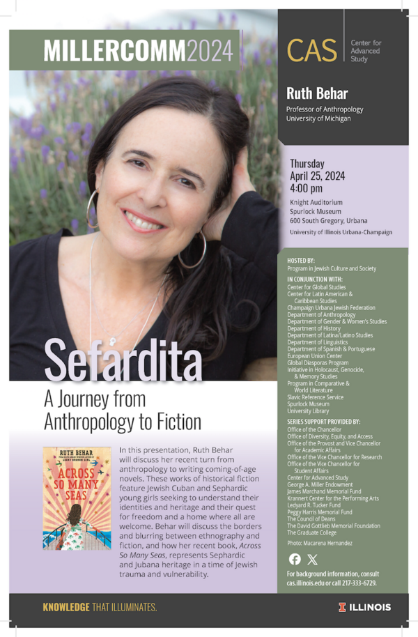 In this presentation, Ruth Behar will discuss her recent turn from anthropology to writing coming-of-age novels. These works of historical fiction feature Jewish Cuban and Sephardic young girls seeking to understand their identities and heritage and their quest for freedom and a home where all are welcome. Behar will discuss the borders and blurring between ethnography and fiction, and how her recent book, Across So Many Seas, represents Sephardic and Jubana heritage in a time of Jewish trauma and vulnerability.