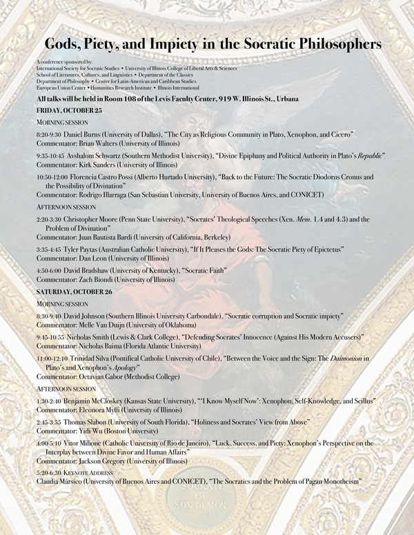 - International Society for Socratic Studies • University of Illinois College of Liberal Arts & Sciences • School of Literatures, Cultures, and Linguistics • Department of the Classics Department of Philosophy • Center for Latin American and Caribbean Studies • European Union Center • Humanities Research Institute • Illinois International