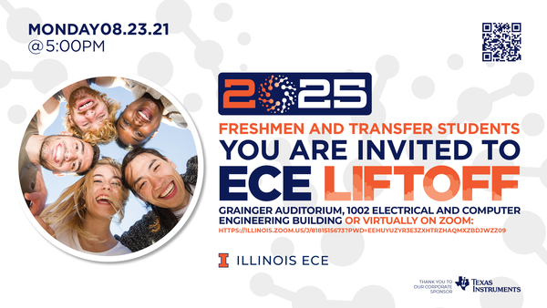 - Please join us for an orientation session for all first year and transfer students in Illinois ECE. Sponsored by corporate partner Texas Instruments, Liftoff will introduce you to the different research areas in the department and the many ECE-affiliated student organizations. Additionally, you will have an opportunity to ask questions of current students re: daily life and the curriculum.All students will receive a class t-shirt in the lobby after the presentation.Not able to join in person? Join via Zoom instead: https://go.ece.illinois.edu/liftoff