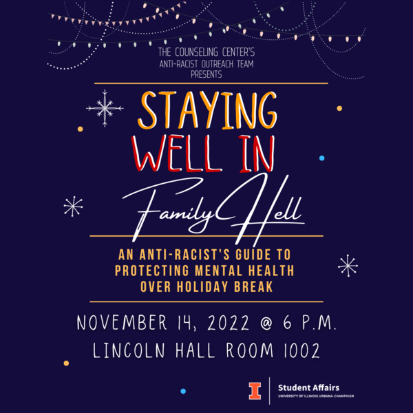 Staying Well in Family Hell: An Anti-Racist’s Guide to Protecting Mental Health Over Holiday Break is meant for students that have or expect familial stress regarding microaggressions, multicultural or racial stress, political disagreements, and such during family or holiday-related activities. Participants will leave with a personalized plan and a variety of coping/communication tools to choose from