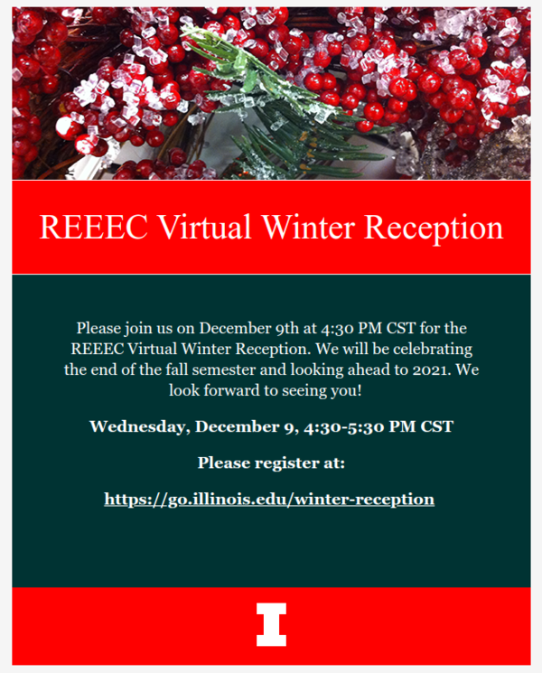 Please join us on December 9th at 4:30 PM CST for the REEEC Virtual Winter Reception. We will be celebrating the end of the fall semester and looking ahead to 2021. We look forward to seeing you!