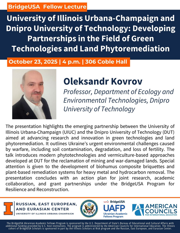 BridgeUSA Fellow Lecture: Oleksandr Kovrov, "University of Illinois Urbana-Champaign and Dnipro University of Technology: Developing Partnerships in the Field of Green Technologies and Land Phytoremediation"