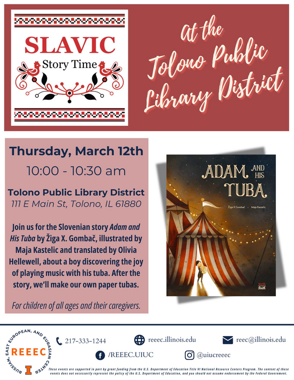 111 E. Main St. Tolono, IL 61880Join us for the Slovenian story Adam and His Tuba by Žiga X. Gombač, illustrated by Maja Kastelic and translated by Olivia Hellewell, about a boy discovering the joy of playing music with his tuba. After the story, we’ll make our own paper tubas.