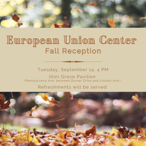 Please join the European Union Center for its fall reception on Tuesday, September 14 at 4pm at the Illini Grove Pavilion (on Pennsylvania Avenue between Dorner Drive and Lincoln Avenue). Refreshments will be served. You can find a map of the Illini Grove here. Pre-registration (link: https://forms.illinois.edu/sec/1000302338) is optional but appreciated.