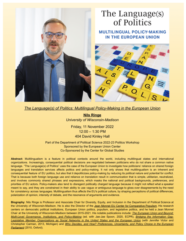 Biography: Nils Ringe is Professor and Associate Chair for Diversity, Equity, and Inclusion in the Department of Political Science at the University of Wisconsin-Madison. He is also the Director of the Jean Monnet EU Center for Comparative Populism. His research centers on democratic political institutions, European Union politics, populism, and legislative politics, and he held a Jean Monnet Chair at the University of Wisconsin-Madison between 2015-2021. His notable publications include: The European Union and Beyond: Multi-Level Governance, Institutions, and Policy-Making (ed. with Jae-Jae Spoon, 2020, ECPR), Bridging the Information Gap: Legislative Member Organizations as Social Networks in the United States and the European Union (with Jennifer Victor and Christopher Carman, 2013, Michigan) and Who Decides, and How? Preferences, Uncertainty, and Policy Choice in the European Parliament (2010, Oxford).