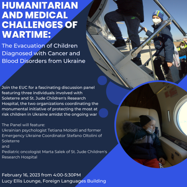 Russia's invasion of Ukraine created acute challenges for patients requiring lifesaving medical care. Among the most vulnerable groups were children receiving treatment for cancer and blood disorders. In the first few months of the war, the Italian charity Soleterre contributed to a major international effort to evacuate these children from Ukraine. The Memphis-based St. Jude Children's Research Hospital collaborated with several international organizations to set up a triage center in Southern Poland to help medically evaluate patients and ultimately triage them to hospitals internationally. Soleterre and St. Jude continue to work with Ukrainian children and their families and respond to the needs of the Ukrainian medical community. Please join the European Union Center at the University of Illinois for this panel discussion about this extraordinary collaborative, international effort in response to the largest military emergency in Europe since World War II.