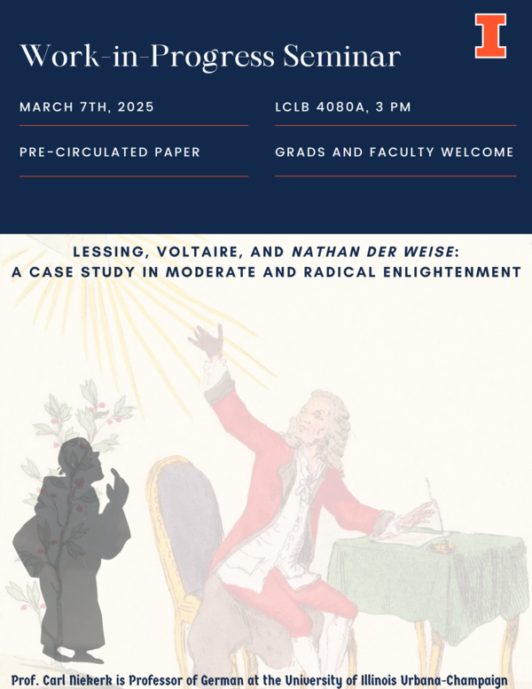 Lessing and Voltaire first met at the Court of Frederick II in 1750, and shortly thereafter Lessing received permission to translate Voltaire’s essays and to have his daily dinner at Voltaire’s table. Eventually however, the relationship between the two soured, and they would not meet again after Voltaire left Prussia in 1753. Carl Niekerk’s paper investigates the dynamics between the two authors. His main thesis is that Voltaire was an exemplary representative of the Moderate Enlightenment and opposed Enlightenment philosophies that would endanger the existing order of society. Lessing, in contrast, was intrigued by Radical Enlightenment thinking and willing to question all the many traditions and hierarchies that had shaped society.