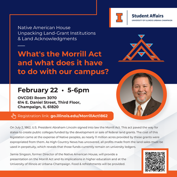 The University of Illinois at Urbana-Champaign is designated as a land-grant institution, which means a land acknowledgement is typically read before wide-ranging functions. That is typically the full extent of which the campus community engages with its land-grant designation. But do folks understand the history of the Morrill Act, the Indigenous peoples who were removed to create this institution, and the ways the university continues to profit through the Morrill Act at the expense of Indigenous peoples? Jamie Singson, former Director of the Native American House, will provide a presentation on the Morrill Act and its implications in higher education and at the University of Illinois at Urbana-Champaign. Food & refreshments will be provided.