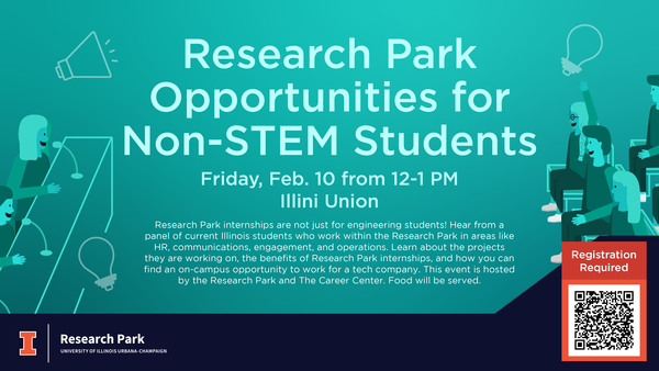 Join us on Friday, February 10 from 12-1 PM at the Illini Union to learn about Research Park Opportunities for Non-STEM Students. Research Park internships are not just for engineering students! Hear from a panel of current Illinois students who have worked for Research Park companies AGCO, AbbVie, and Graybar in areas like HR, communications, and graphic design. Learn about the projects they are working on, the benefits of Research Park internships, and how you can find an on-campus opportunity to work for a tech company. This event is hosted by the Research Park and The Career Center. Food will be served.