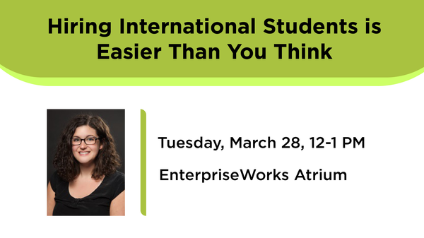 Join us on Tuesday, March 28 from 12-1 pm for Hiring International Students is Easier Than You Think, a presentation by Jennifer Park, Assistant Director, International Student and Scholar Services.