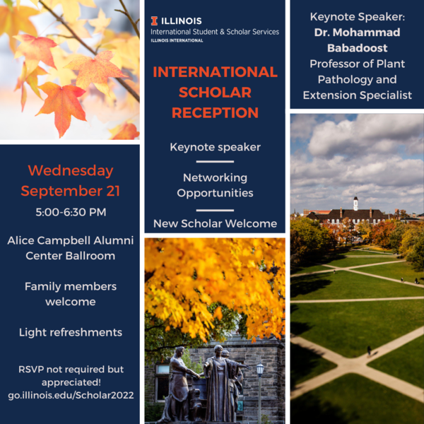 All international scholars and their families are invited to join us for a Welcome Reception on Wednesday, September 21st from 5-6:30 pm at the Alice Campbell Alumni Center. Our keynote speaker will be Dr. Mohammad Babadoost. Light refreshments will be served. Please RSVP at go.illinois.edu/Scholar2022.