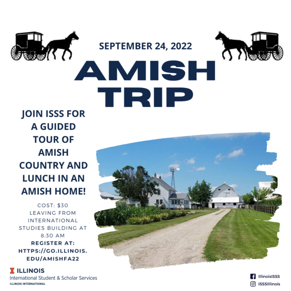 ISSS is hosting our Amish trip on Saturday, September 24th. We will leave the International Studies Building (910 S. 5th Street, Champaign) at 8:30 am and return around 4 pm. During this trip, we will have a guided tour through Amish country, eat lunch in an Amish home, go shopping at an Amish store, and more! The cost for this trip is $30 per person. Please register at https://go.illinois.edu/AmishFA22