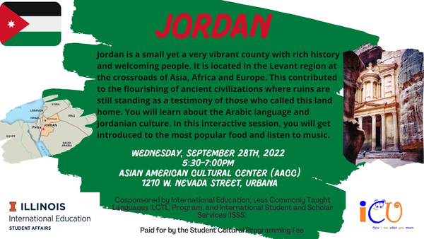 Jordan is a small yet a very vibrant country with rich history and welcoming people. It is located in the Levant region at the crossroads of Asia, Africa, and Europe. This contributed to the flourishing of ancient civilizations where ruins are still standing as a testimony of those who called this land home. You will learn about the Arabic language and Jordanian culture. In this interactive session, you will get introduced to the most popular food and listen to music.