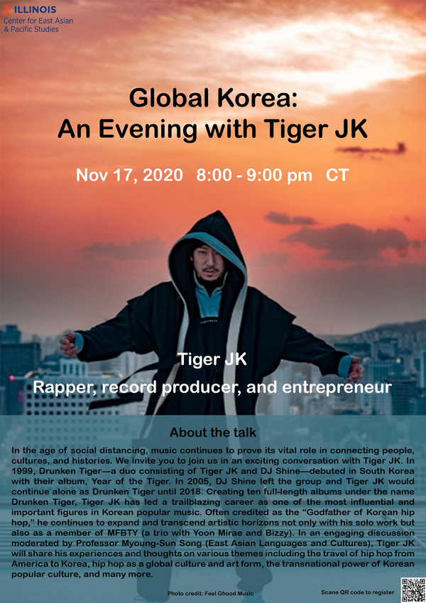 In the age of social distancing, music continues to prove its vital role in connecting people, cultures, and histories. We invite you to join us in an exciting conversation with Tiger JK. In 1999, Drunken Tiger—a duo consisting of Tiger JK and DJ Shine—debuted in South Korea with their album, Year of the Tiger. In 2005, DJ Shine left the group and Tiger JK would continue alone as Drunken Tiger until 2018. Creating ten full-length albums under the name Drunken Tiger, Tiger JK has led a trailblazing career as one of the most influential and important figures in Korean popular music. Often credited as the “Godfather of Korean hip hop,” he continues to expand and transcend artistic horizons not only with his solo work but also as a member of MFBTY (a trio with Yoon Mirae and Bizzy). In an engaging discussion moderated by Professor Myoung-Sun Song (East Asian Languages and Cultures), Tiger JK will share his experiences and thoughts on various themes including the travel of hip hop from America to Korea, hip hop as a global culture and art form, the transnational power of Korean popular culture, and many more.