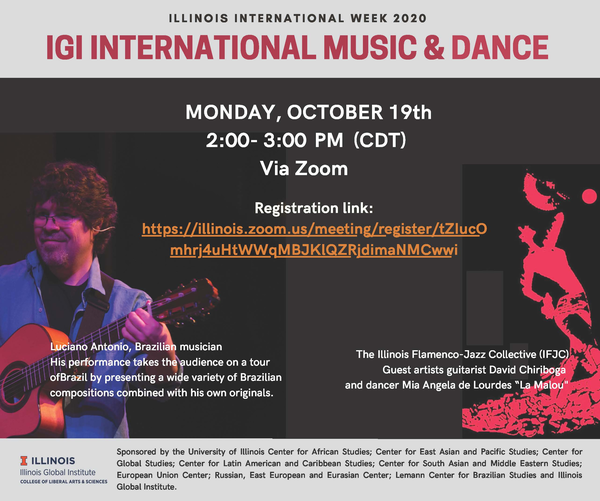 The Illinois Flamenco-Jazz Collective (IFJC) will be presenting pre-recorded videos of Sevillanas de Triana and Tangos de Graná. Our guest artists guitarist David Chiriboga and dancer Mia Angela de Lourdes “La Malou” will be featured thanks to the Global Intersections Grant funded by the Center for Global Studies and the European Union Center. The music will be followed by a brief informational and Q&A session with IFJC student leaders Alyssa Teijeiro-Ficht (dance) and Brian Stark (music)