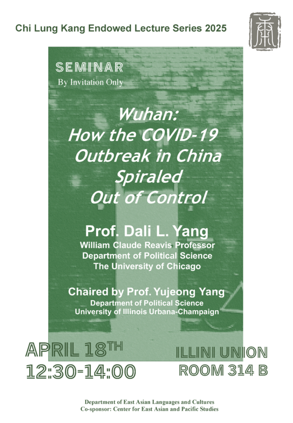 The Department of East Asian Languages and Cultures is delighted to announce the upcoming Kang Endowed Lecture featuring Professor Dali L. Yang at University of Chicago on Apr 17 and 18. As a part of this annual event, a lunch seminar will commence at 12:30 on Apr 18 (Friday) focusing on Yang’s book Wuhan: How the COVID-19 Outbreak in China Spiraled Out of Control, published by Oxford University Press in 2024. This book is praised by many scholars in related fields. For example, Bruce Dickson from George Washington University comments on the book, stating, “In this remarkable book, Dali Yang offers a gripping account of the outbreak of Covid-19 in China: day by day, and even hour by hour. It will be the definitive account of the outbreak and the Chinese government's mishandling of it.”