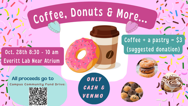 Join us Tuesday, October 28 from 8:30 to 10 a.m. in Everitt Hall (between the front doors and the atrium) for coffee, donuts, and delicious home-baked pastries.