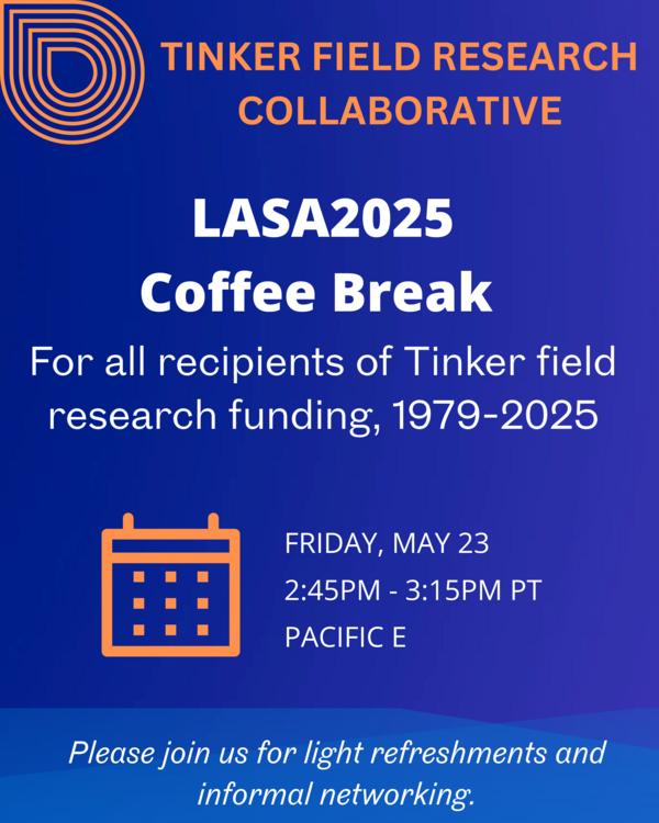 Join us for a special Coffee Break hosted by the Tinker Field Research Collaborative during LASA2025! This gathering is open to all past and present recipients of Tinker field research funding from 1979 to 2025. Reconnect with fellow researchers, share stories from the field, and build new connections in an informal and friendly setting.