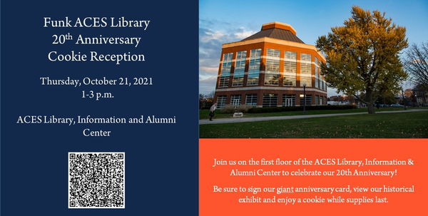 The Funk ACES Library celebrates its 20th anniversary this year! Join us for a Cookie Reception in the 1st floor atrium on Thursday, October 21 from 1-3 p.m.